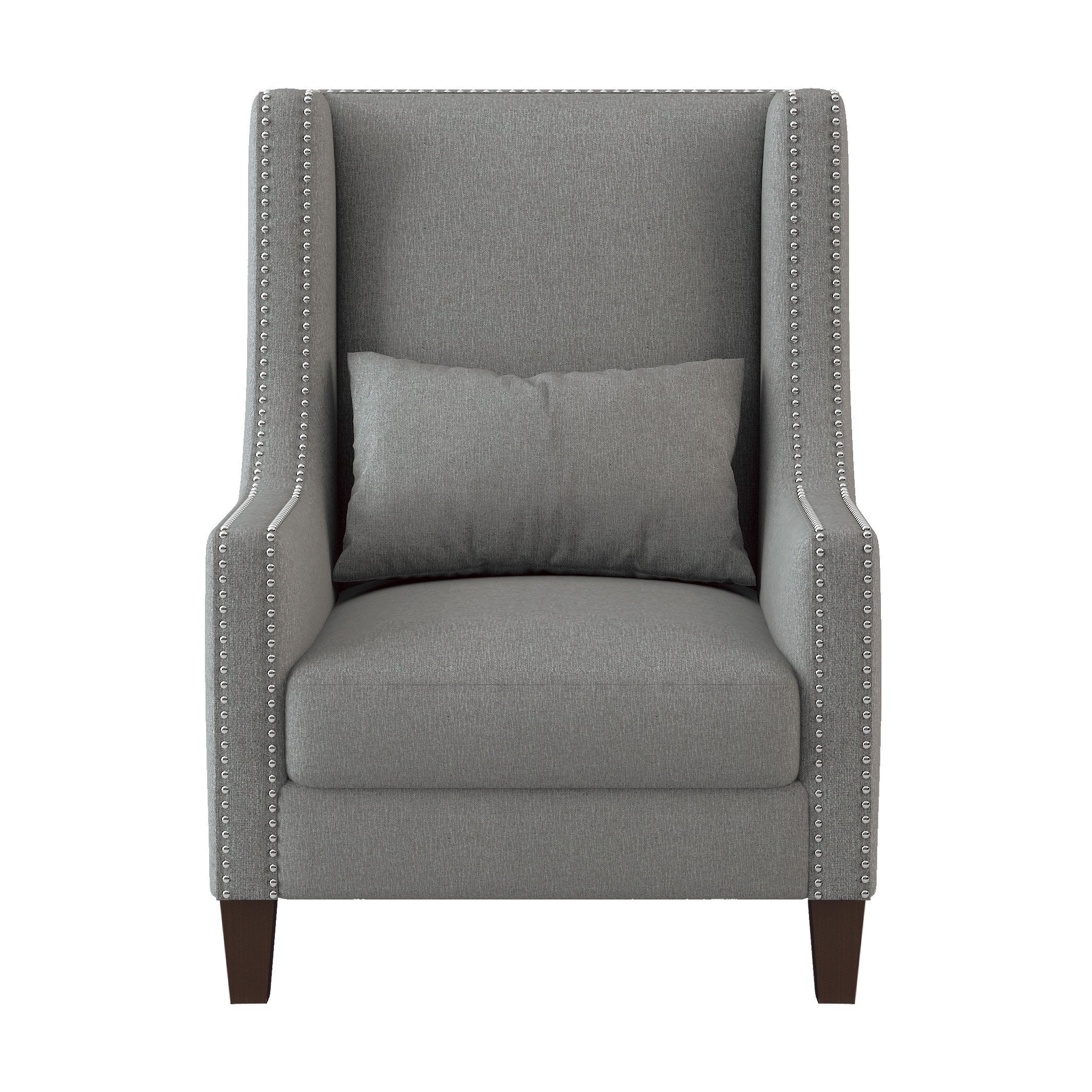 Description & DimensionsModern-traditional styling is perfectly executed in the design of the Keller Collection. The high-back profile of this elegant accent chair is defined by nailhead trim and its seating is enhanced by the back-supporting kidney pillow. This accent chair is offered in light gray for versatile placement within your decorative scheme. Also available in dark gray.PRODUCT DIMENSIONS: Overall Dimension: 29" x 32.75" x 38.25"HSeat Width: 20.25"Seat Depth: 22.5"Seat Height: 19.75"Arm height: 23"Pillow dimension: 19.5"x 12" (1)Listing Includes: One Accent Chair Only.Simple Assembly Require.