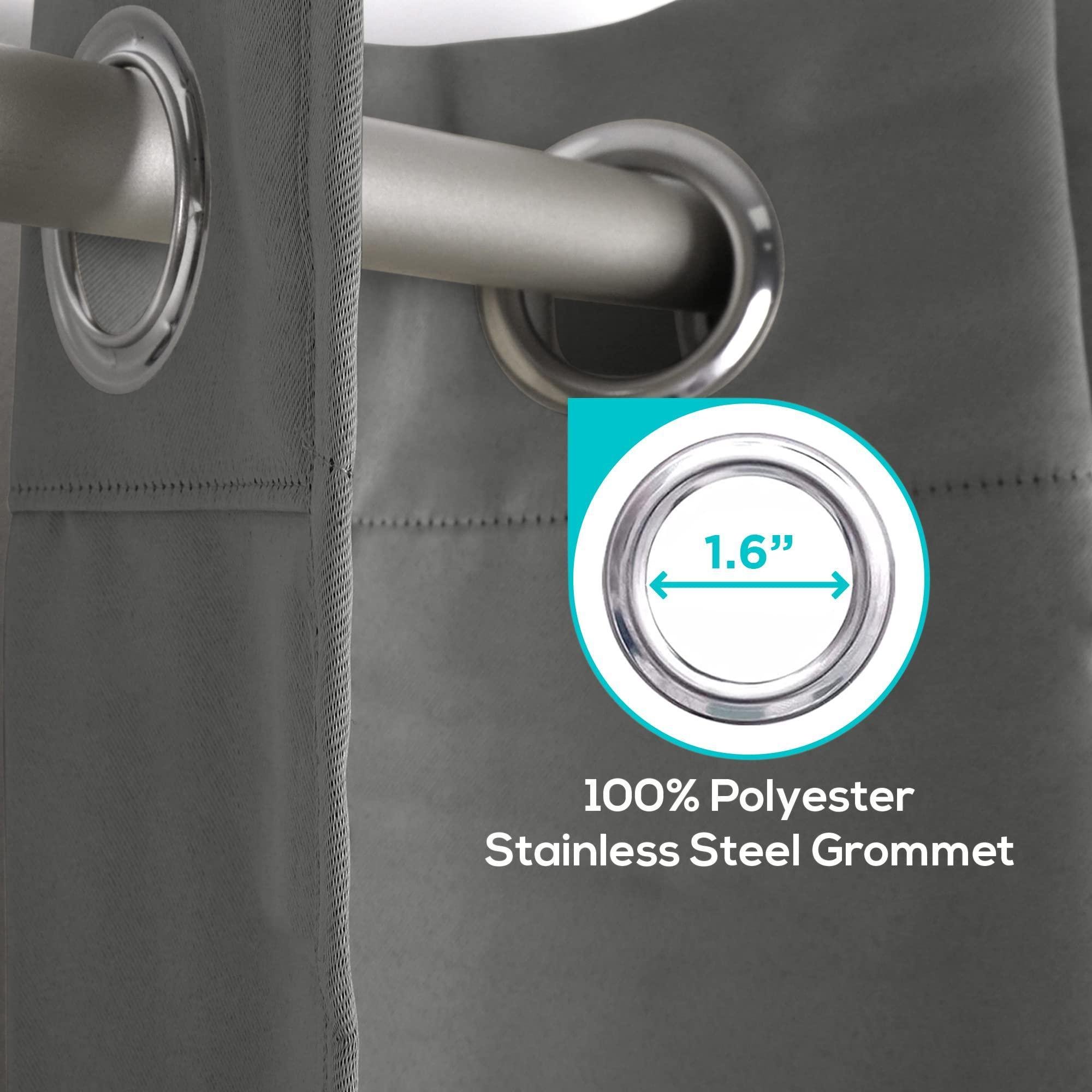 1.what's in the package? a set of 2 dark grey blackout curtain panels, each panel measures 42 inches the width and 63 inches the length. each curtain panel includes 6 silver metal grommet rings, each grommet inner diameter is 1.6 inch, which is compatible with most rods, and easy slides to install.