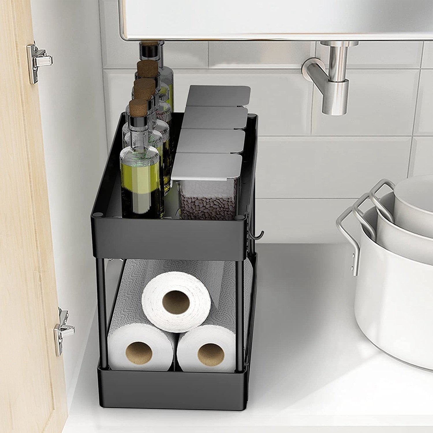 Home > 2-Tier Under Sink Shelf Organizer Space Saving Under Bathroom Sink Storage Rack w/ 4 Hooks