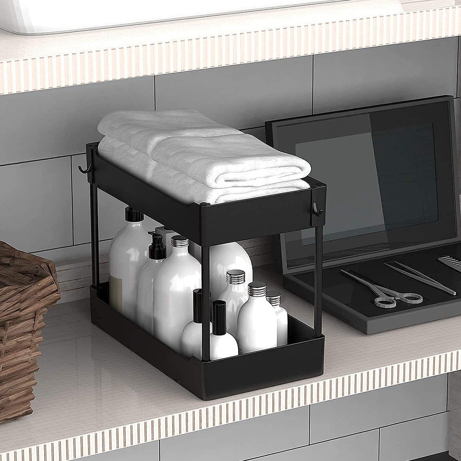 2-Tier Under Sink Shelf Organizer Space Saving Under Bathroom Sink Storage Rack w/ 4 Hooks