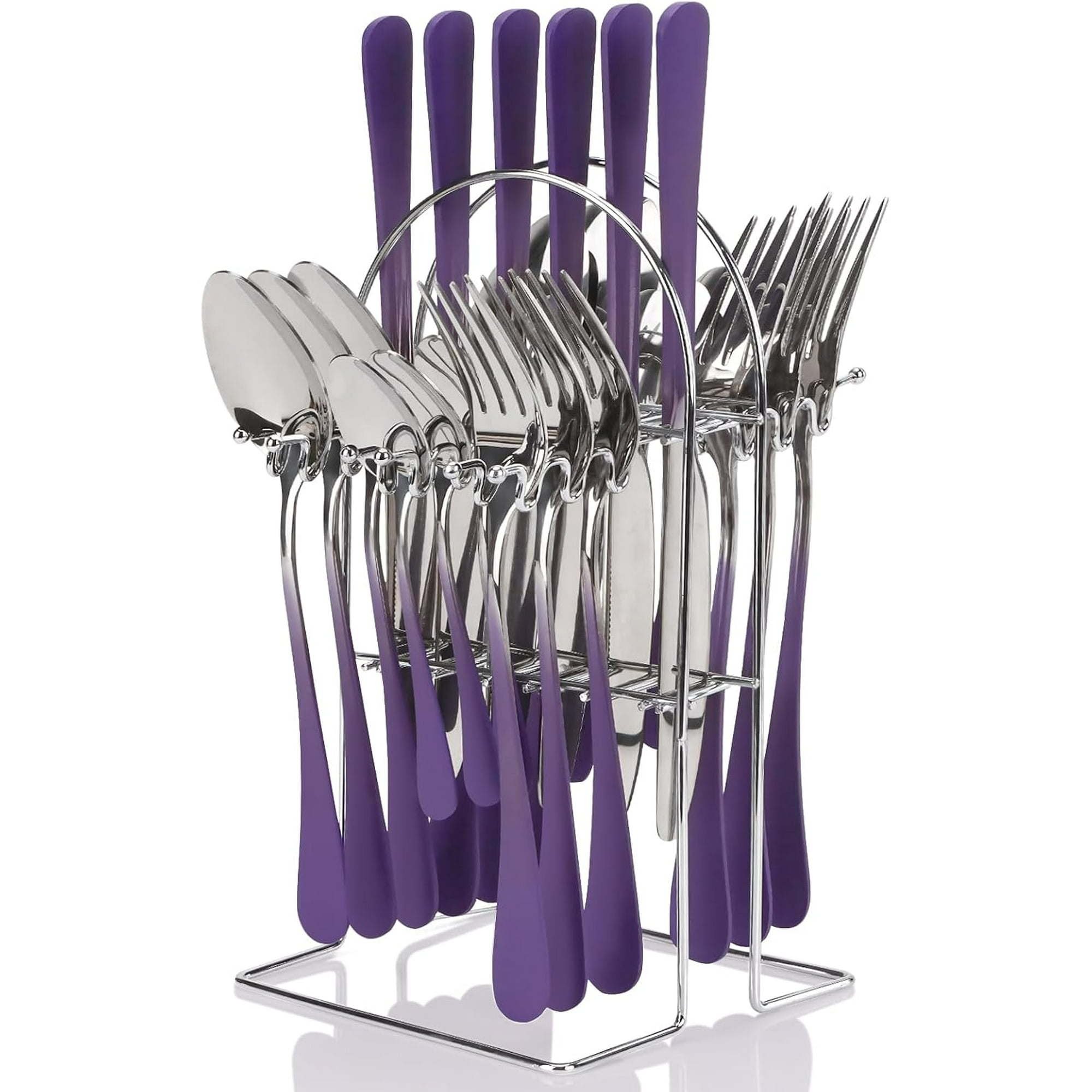 [SILVERWARE SET WITH RACK]This hanging cutlery set is different from other cutlery, this set has an extra rack for easy storage and carrying, which helps to keep the knives and forks dry and hygienic after cleaning. It can be placed in the corner of dining table and kitchen without taking up space, making the kitchen and dining table more neat and beautiful.