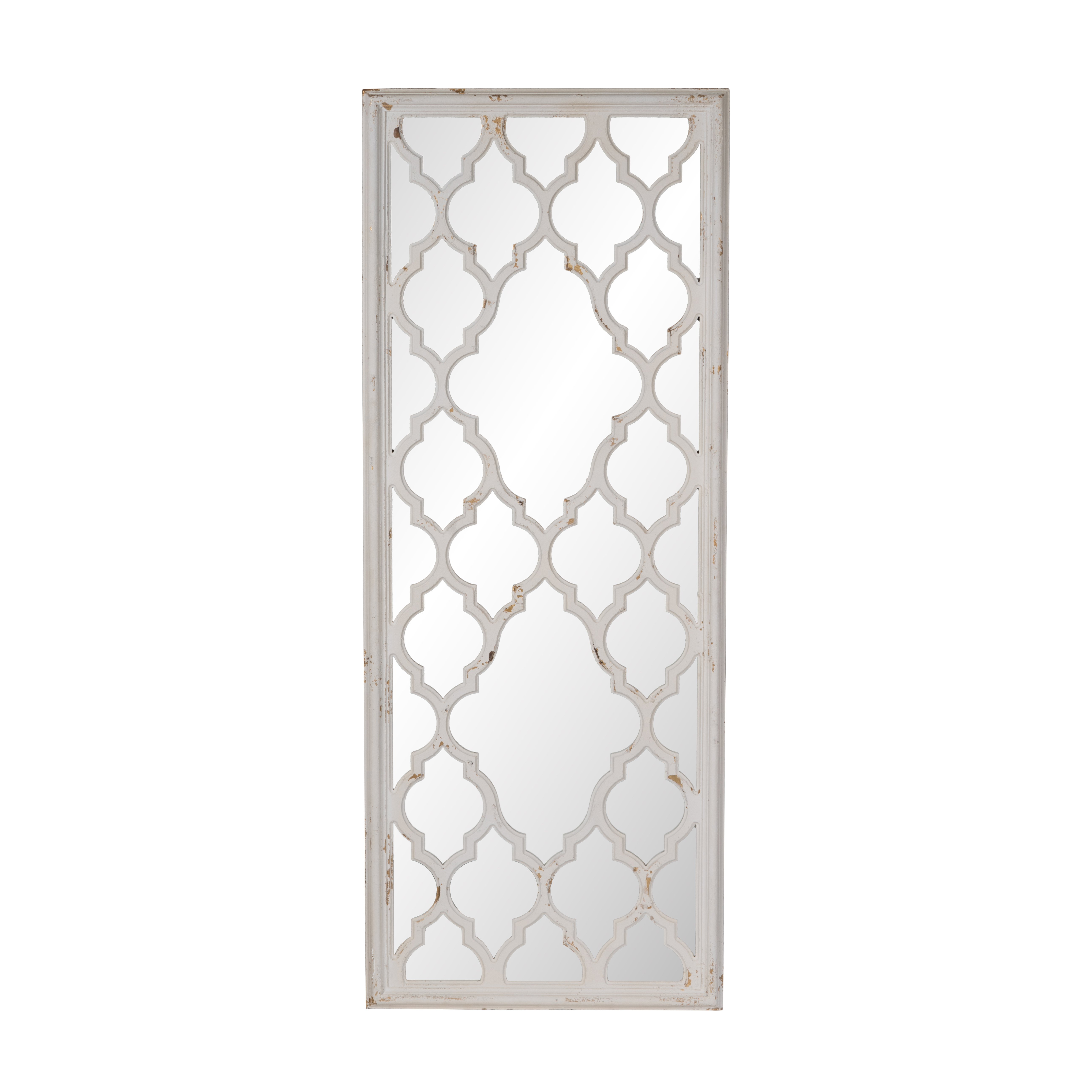 The DesignPairing a classic pattern and a distressed white finish,this gorgeous mirror brings an elegant,slightly vintage touch to any room.This lovely mirror fits perfectly in a luxurious master bathroom,airy sunroom,or sweeping foyer.With its tall 59″ height,this mirror offers a full-length look with classic,graceful style that complements virtually any style of home.