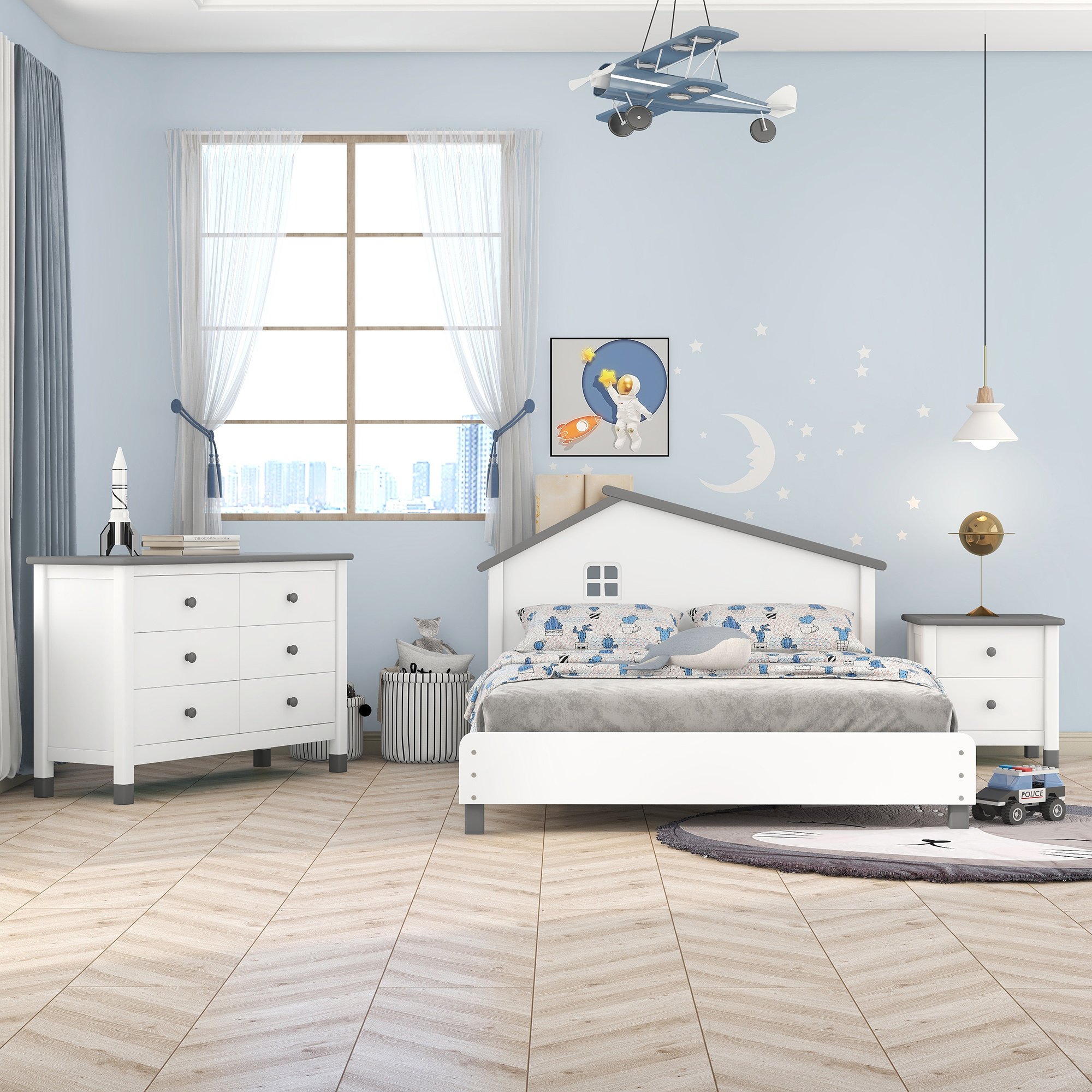 • Charming and Functional Design: The platform bed features a unique house-shaped headboard, blending seamlessly with any decor style. The white and gray color palette adds a modern rustic charm, while the contrasting colors on the nightstand and dresser bring a warm and inviting touch.