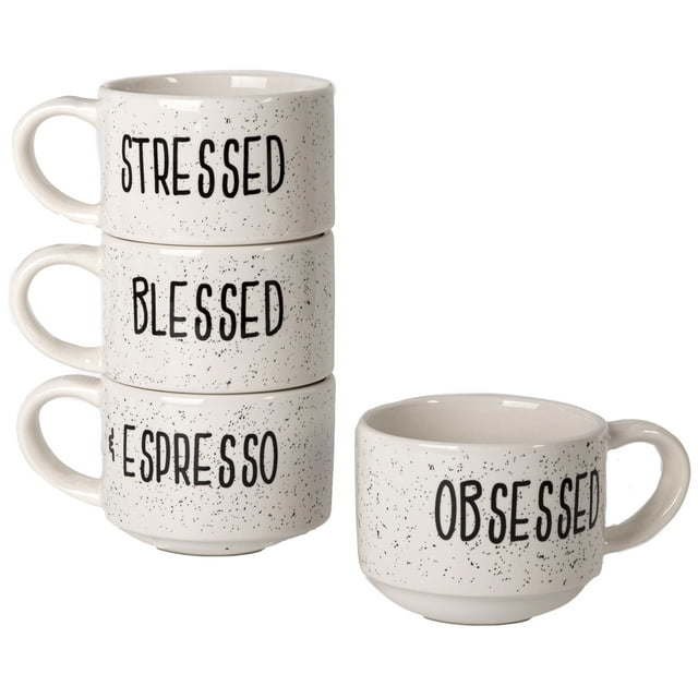 8 oz Black and White Espresso Stoneware Mug Set with rack. Mugs feature a speckled design and different says such as "STRESSED", "BLESSED", "& ESPRESSO", and "OBSESSED". Great for Kitchen countertop or shelf. The set makes a great gift for coffee and tea drinkers. Microwave and dishwasher safe.