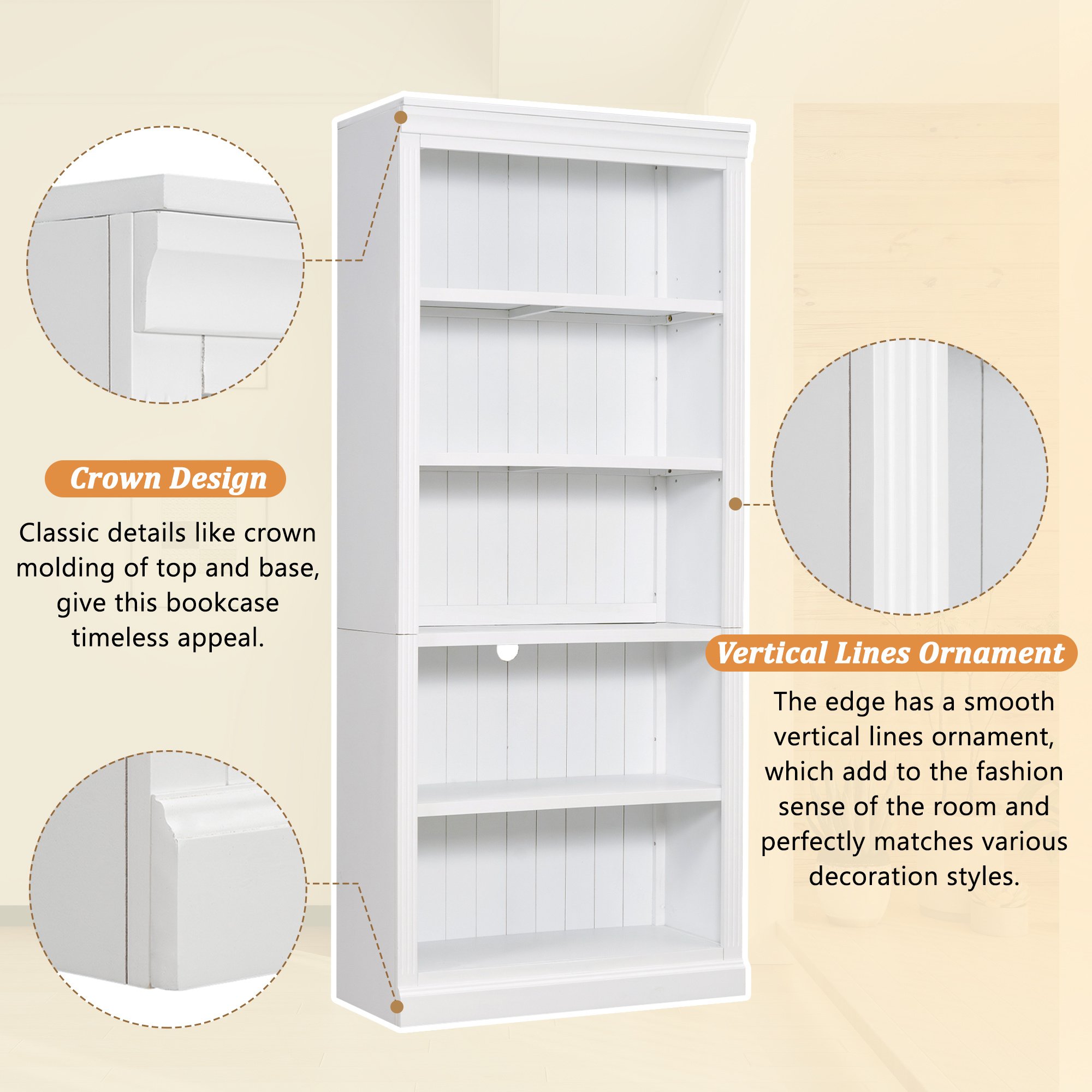 This sleek and modern 5-tier bookshelf brings both functionality and style to your home. With five spacious shelves, it offers ample room to display books, photographs, decor, or even organize cables and electronics. The minimalist design, combined with a vertical lines ornament, makes it an elegant addition to any living room, office, or study. Crafted from premium solid wood and MDF board, the bookshelf is both durable and stable, supporting up to 55 lbs per shelf. Plus, its adjustable shelves offer customization for your storage needs, while an integrated cable hole ensures tidy organization for tech enthusiasts.