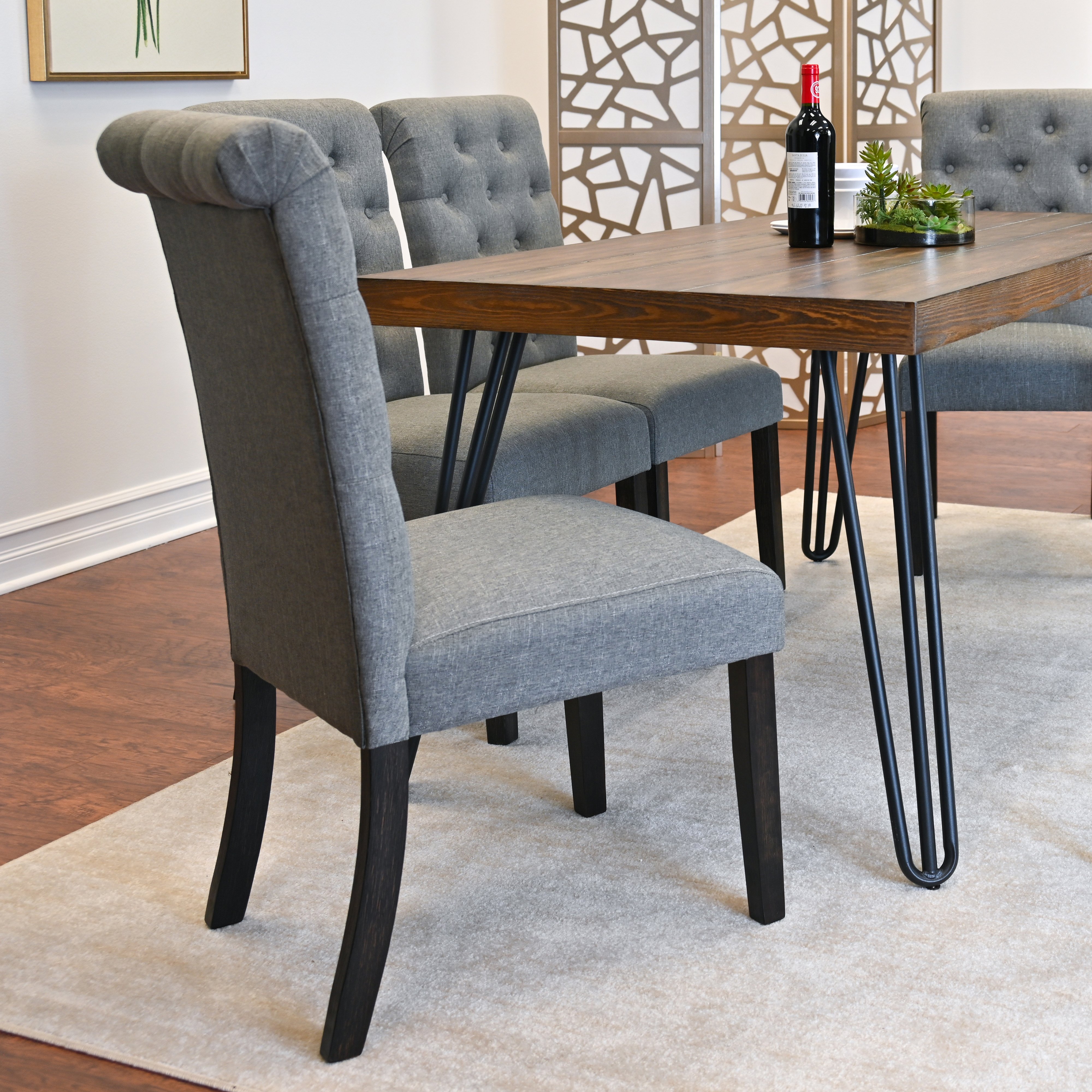 • Six chairs upholstered in soft polyester fabric with elegant button-tufted accents.
