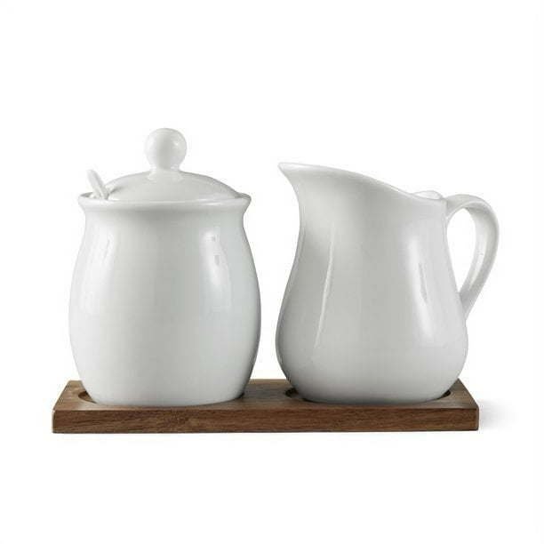This is a Better Homes & Gardens white porcelain Cream and Sugar Set on an acacia base. This is a 5 piece set with both a creamer and a sugar dish, the wood base and a small porcelain spoon inside of the sugar side. This is a stylish and unique set that will add flair to any counter area. The acacia base is about 7.75" x 4.0", the porcelain dishes are about 5" tall and the creamer capacity is 15 ounces. Use these items individually or as a set to add versatility to this item. This ships in a re-shipper box for safety and does not come in a gift box.