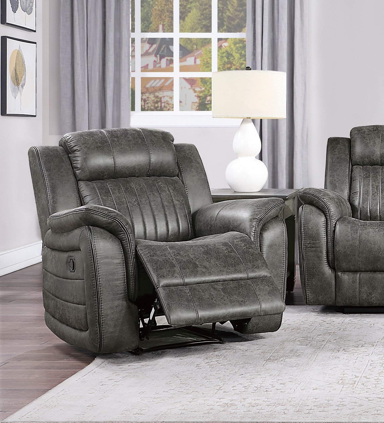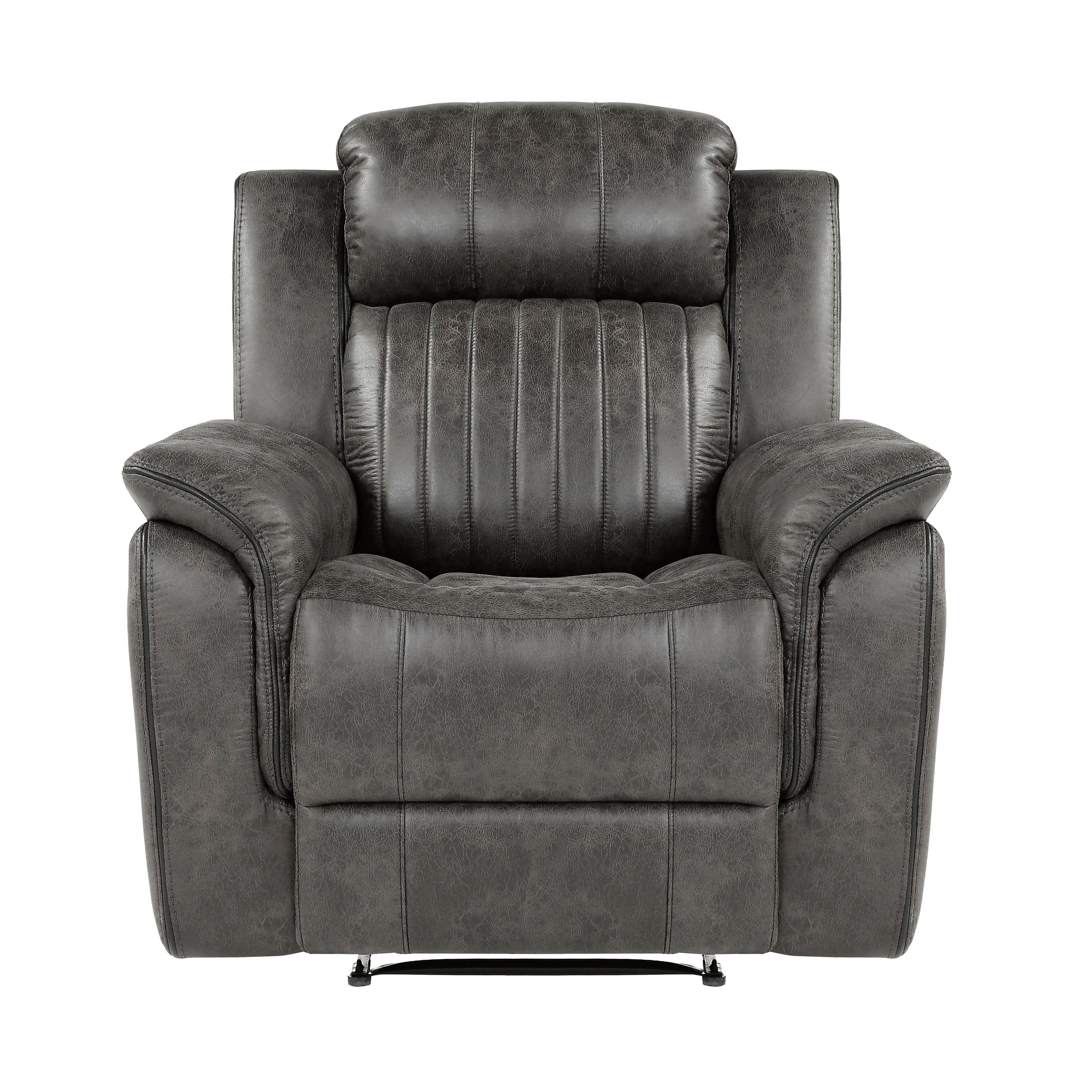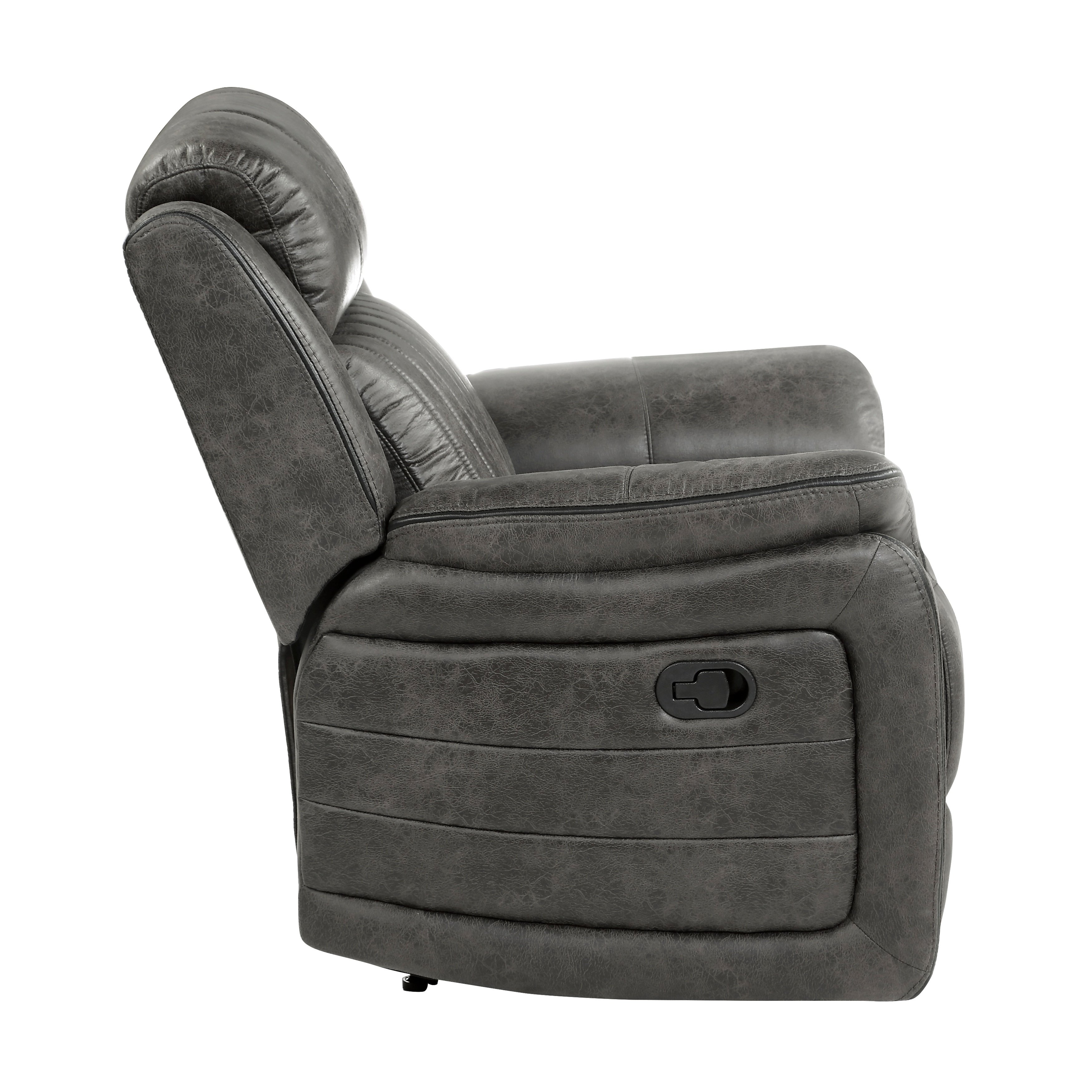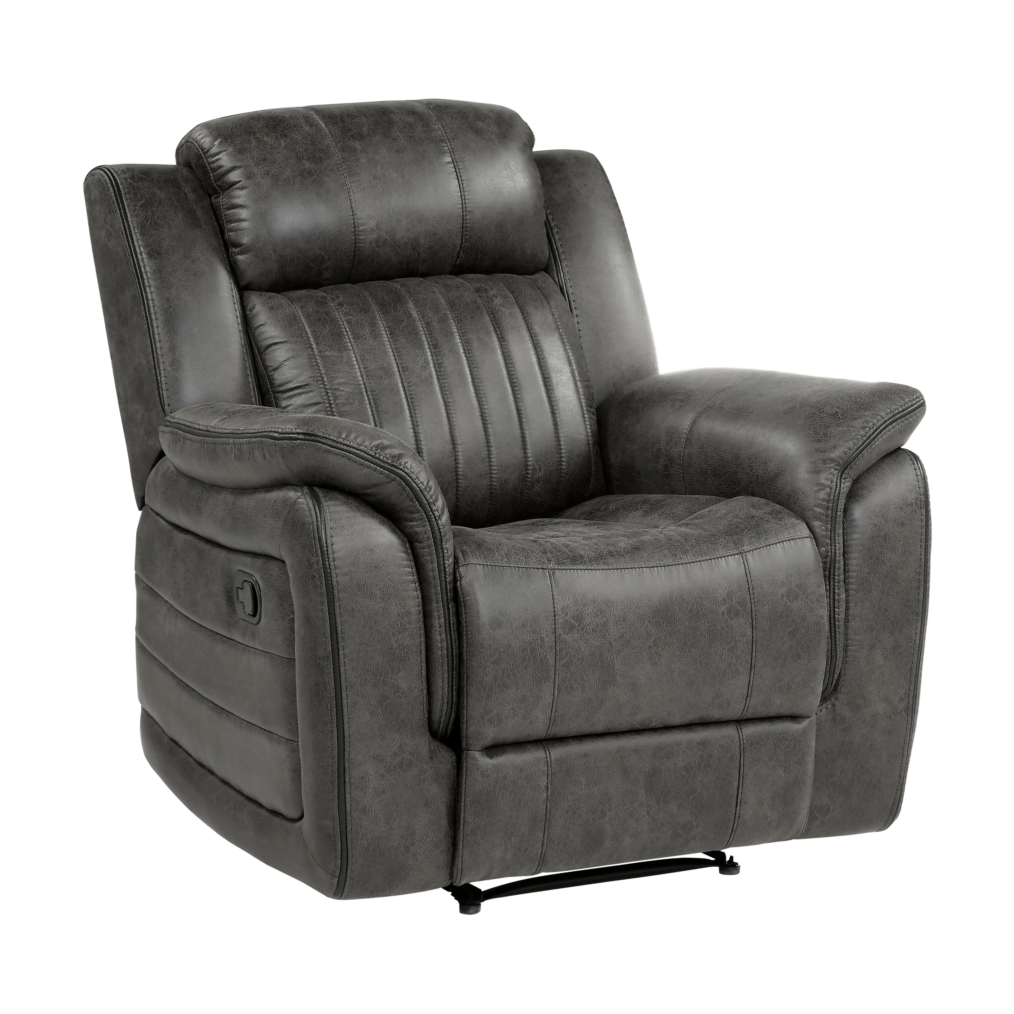 Description & DimensionsThe design of the Centeroak Collection provides a platform for your relaxing downtime. From the classic transitional style to the versatile neutral color of the brown-ish gray polished microfiber fabric covering, this chair is the perfect addition to your living room. Plush seating features vertical tufting, pillow-top arms, enhanced by the reclining mechanism which is engaged with a pull of the side mounted tab, taking you from seated to prone in an easy motion.PRODUCT DIMENSIONS:Overall Dimension: 39.5" x 38" x 41"HSeat Width: 19.5"Seat Depth: 21"Seat Height: 20.5"Arm height: 26"Fully reclined length: 65.5"Fully reclined height: 32"Doorway width: 26"Listing Includes: One Reclining Chair Only.Sofa and Loveseat: Not included.Simple Assembly Require.