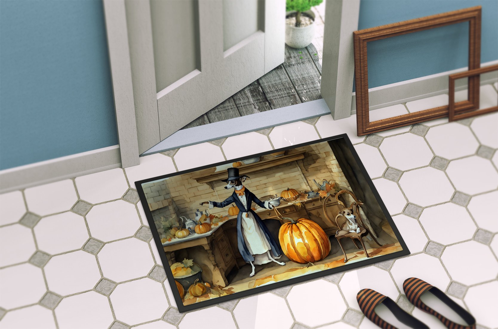 Doormat featuring breed specific Italian Greyhound artwork. Celebrate Halloween with this Halloween Doormat. Welcome your guests in style with our Artwork Door Mat, designed to withstand almost any weather condition. This mat, measuring approximately 24 by 36 inches, is held together by durable black binding tape. Its top layer, composed of polyester felt, is dyed with the eye-catching image you see on the mat. A few layers below provide the mat with stability, while its rubber bottom is stamped to help prevent slipping and ensures safety. Our mat works wonderfully as both an indoor or outdoor door mat. For cleaning, simply hose it off with water or use a power washer - no need for any cleaner that produces suds. Avoid scrubbing with a brush, instead, opt for the vacuum on floor setting. Designed manufactured and printed in the USA, this mat is a perfect addition to your porch, outdoor kitchen, entryway, or any indoor space. Its unique design makes it a charming decorative rug that greets your guests and adds a stylish touch to your home decor.