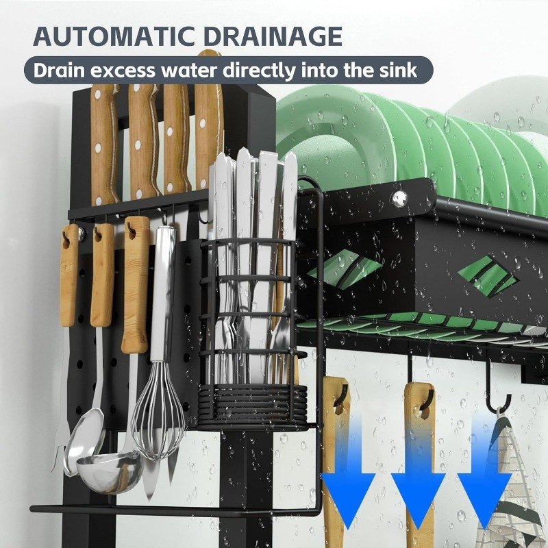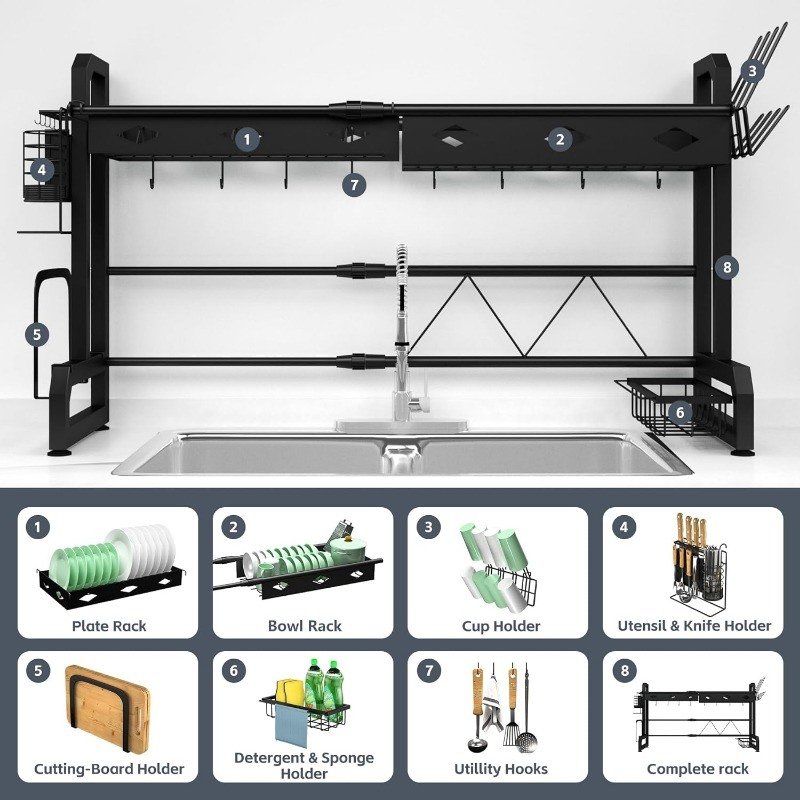 • ⚪EASY TO INSTALL:Installed above the sink to drain excess water directly into the sink. Package includes, 4 Anti-slip Mats, 2 Support Stands, 1 Steel Tubes, 1 Bowl Rack, 1 Dishes Holder, 1 Utensil & Knife Holder, 1 Cutting-Board Holder, 1 Cups Holder, 1 Square Basket and 8 Hooks. Some parts are adjustable and removable thus you can DIY them to your preferences.
