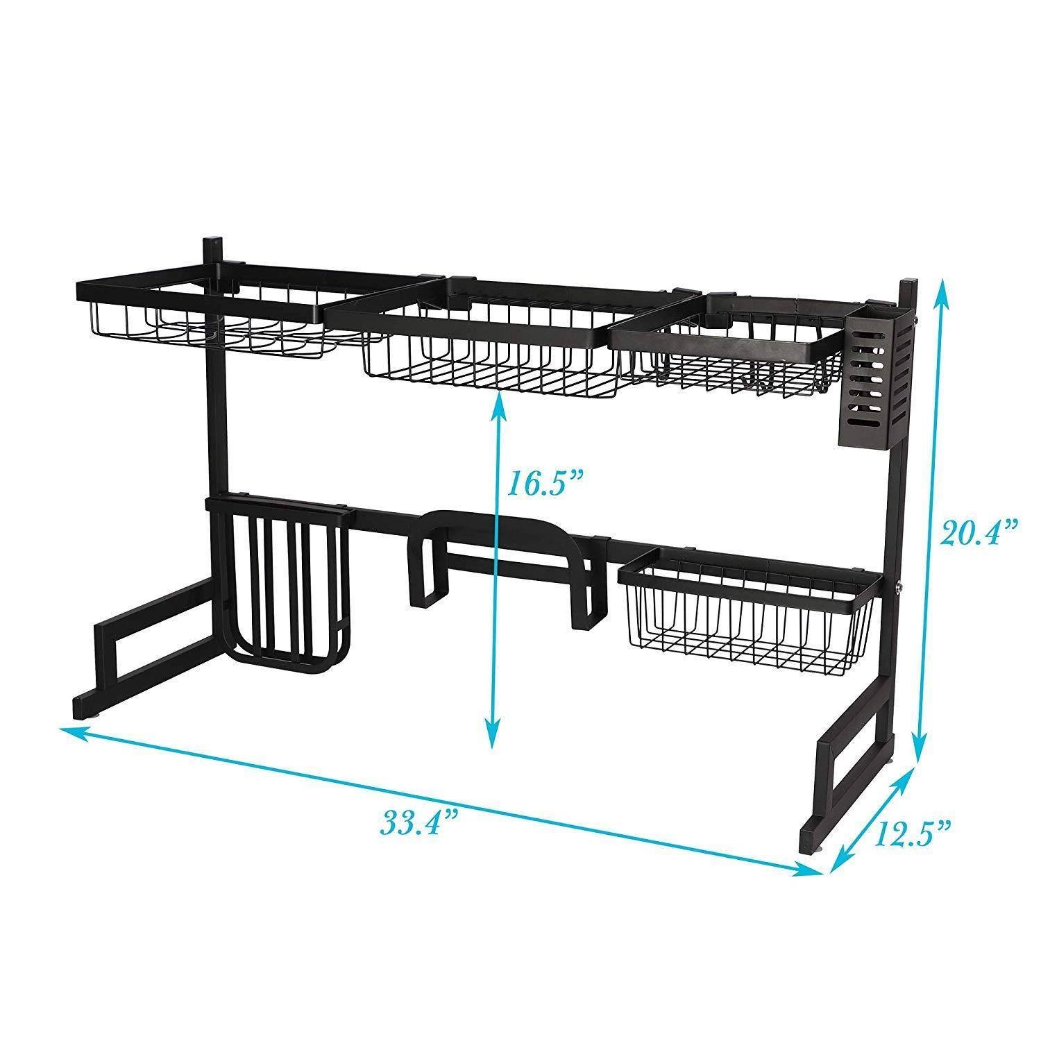 Large Size: 33.4" L x 12.5" W x 20.4" H. This rack will require the length of the sink to be ≤33.4" and the height of the faucet to be ≤16", please MUST measure before the purchase.