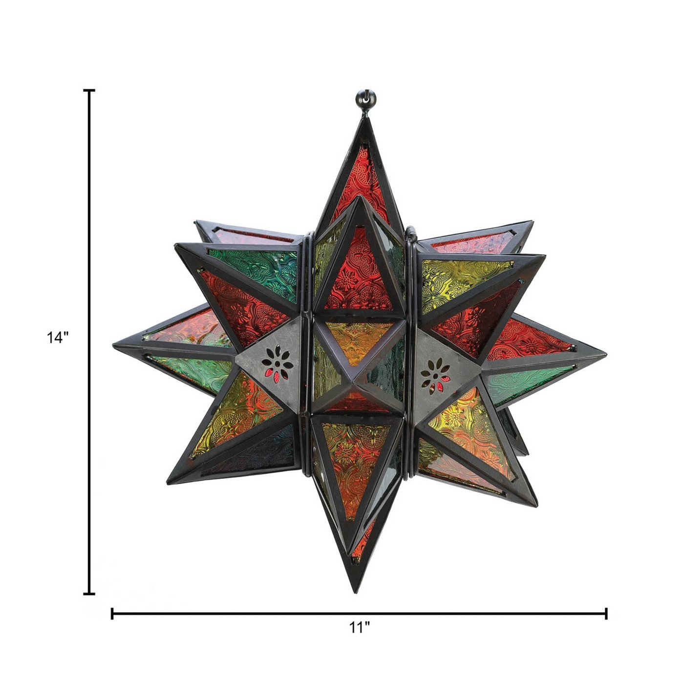 • This Moroccan style star candle lantern casts gorgeous light on any table spread and provides a warm glow on brisk nights. Its decorative metal cutouts and ornate glass panes lend an exotic flair to any home.