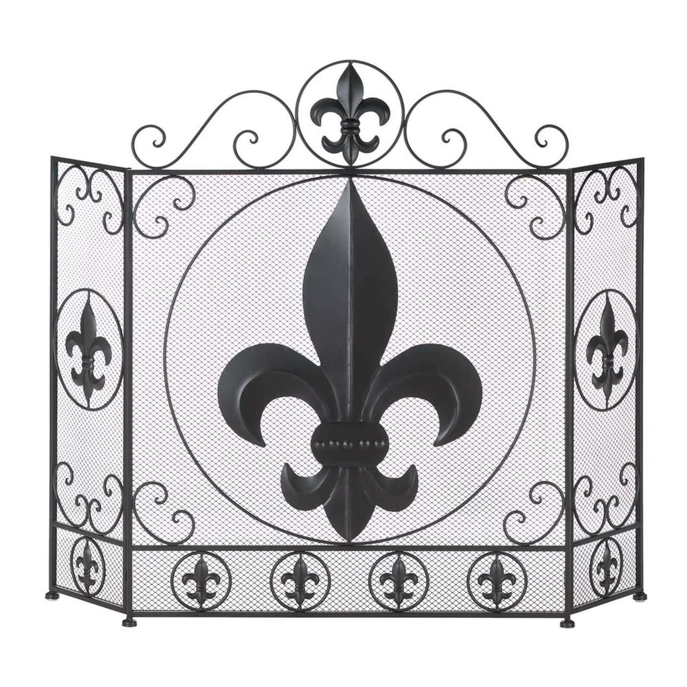 • This stylish fireplace screen makes a big statement in your chic decor. The center panel of this tri-fold screen features a large fleur-de-lis symbol surrounded by metal flourishes and smaller versions. The side panels mimic the central design and are adjustable to fit into your space.