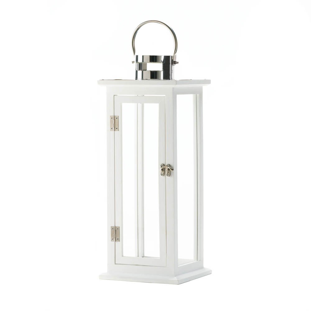 • standing tall, this slim wooden candle lantern is the perfect blend of classic design and modern style. The crisp white paint, silver hardware and stainless steel hanging loop turns candlelight into a stunning show.