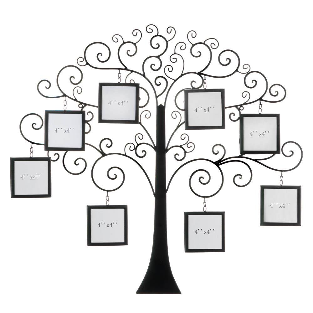 Proudly display your family's history with this beautiful family tree. This gorgeous wall hanging features a design with scrolling branches of metal to hold frames with pictures of your loved ones. Ideal as an accent piece alongside almost any style decor, from traditional to eclectic. Weight 5 pounds. 31" x 0.5" x 29". Iron, Glass, MDF Wood. UPC Number: 849179040796.