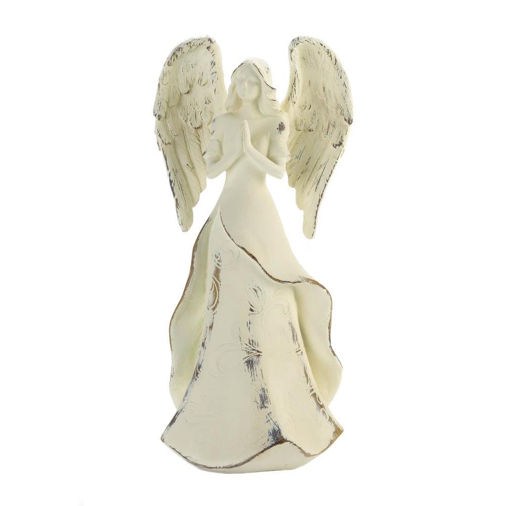 May you find the strength to carry on. This angel brings serenity to your home and is a beautiful accent piece all year long. The distressed ivory finish reminds us of the French countryside and the simple life. She makes a lovely hostess gift, or a wonderful gift for anyone. Weight 0.8 pounds. 4" x 3" x 8.5". Polyresin. UPC Number: 849179039783.