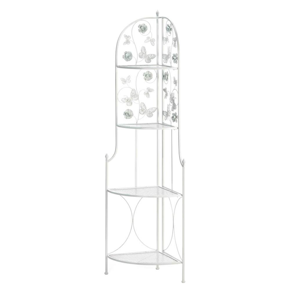 • This corner rack features four latticework shelves to hold your favorite potted plants or trinkets of any kind. Butterflies and flowers embellish the white iron scrollwork to create a friendly garden atmosphere indoors or out. Place in a sunroom, on a patio, or deck to add greenery to your space. This corner rack features four latticework shelves to hold your favorite potted plants or trinkets