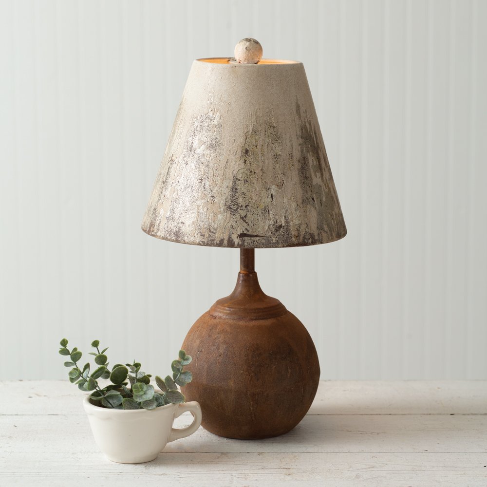 This antiqued lamp features an iron cannon ball base and a metal lampshade that has distressed colors. It takes a standard light bulb which is not included. 60-watts is the maximum suggested bulb wattage for this item. The cannon ball measures 6'' dia.