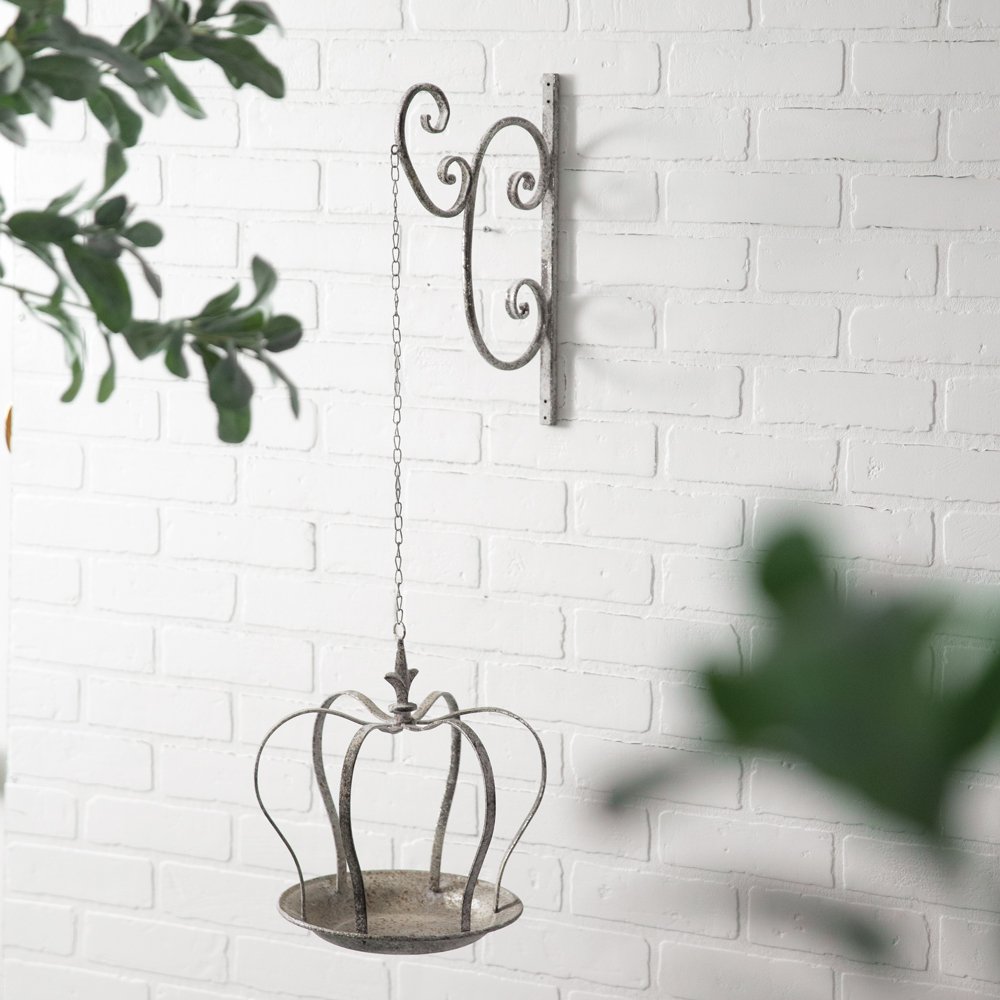 Welcome your feathery friends with regality by displaying our Hanging Crown Feeder outdoors. This item is crafted from metal and is one connected piece. The crown measures 12¼''H. To hang, use its four screw holes.
