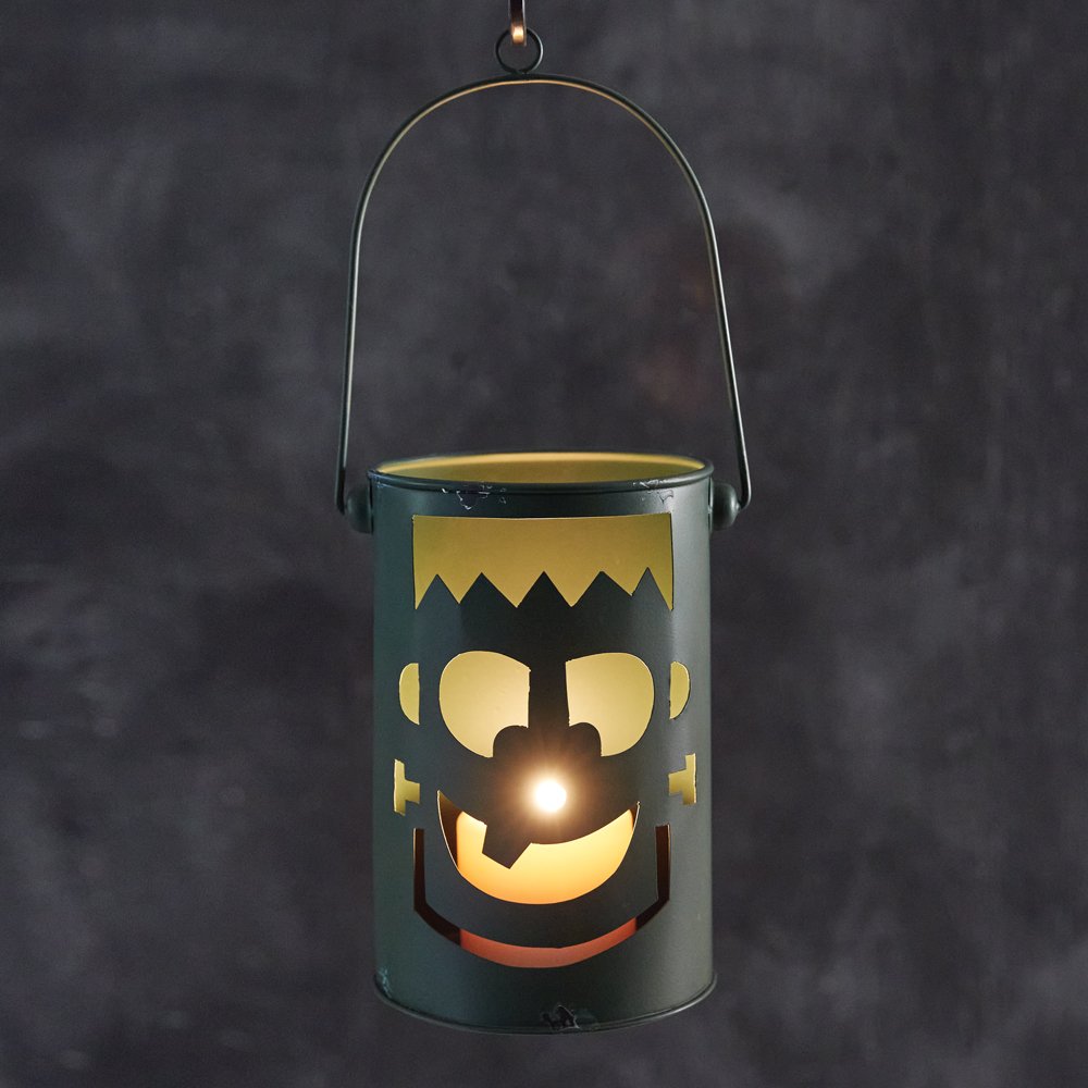 Our Frankie isn't frightful! Illuminate the steps of a porch on a ghoulish Halloween night with his cheerful face. Simply place a candle inside to bring him to life. Item is made of metal and is 14''H with handle extended.