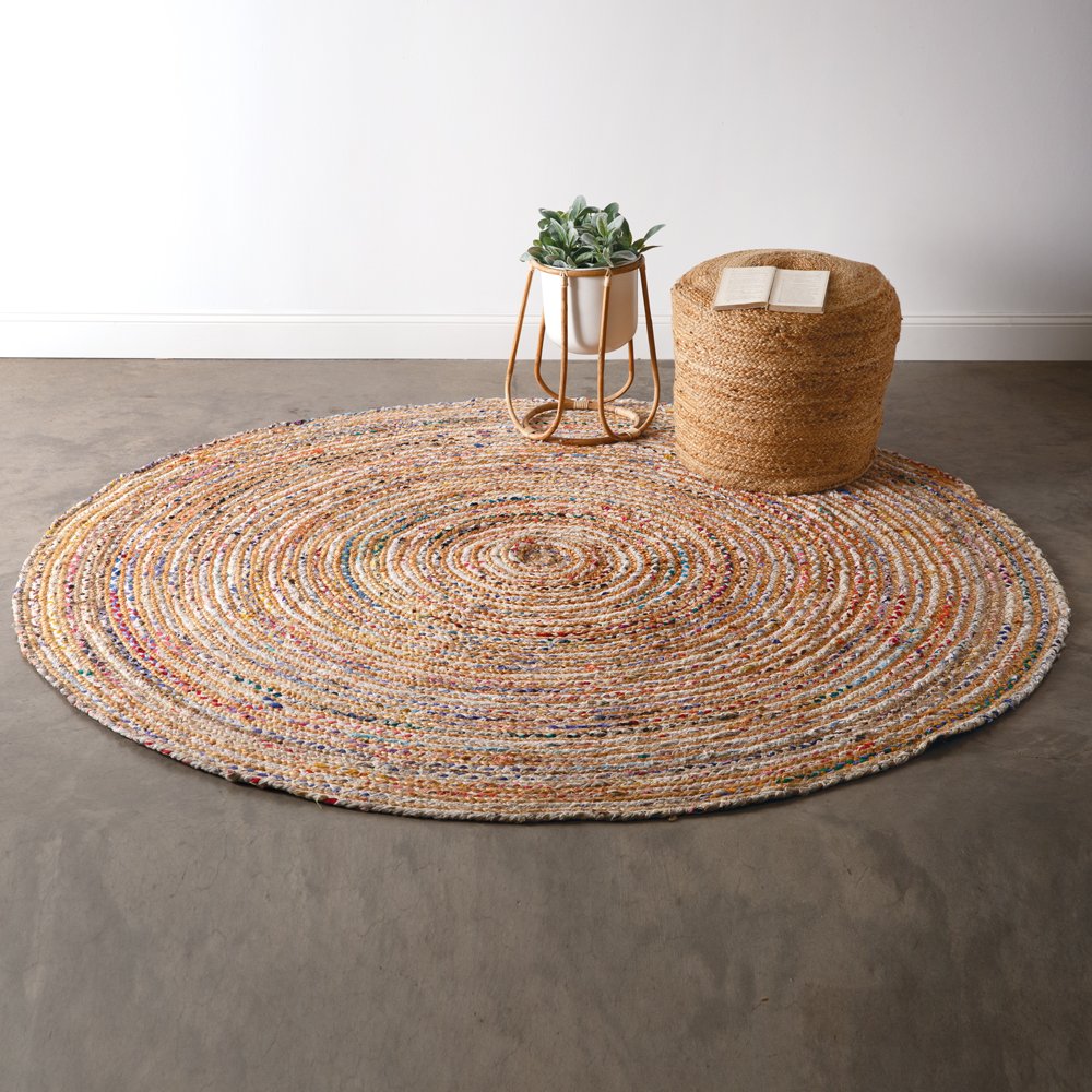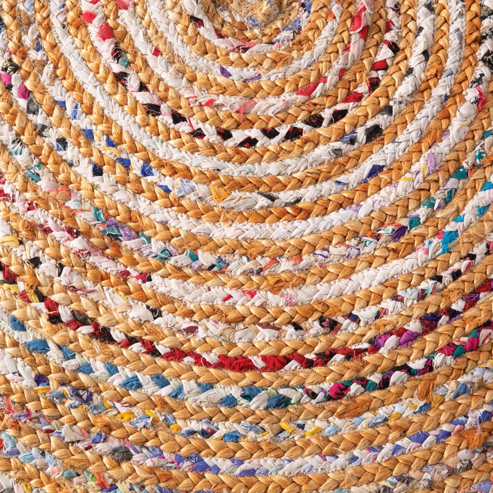 Brighten your room with a colorful hand-braided rag rug. Hand-crafted out of colorful cotton pieces and jute, each rug carries with it a variation in color and pattern. This rug measure 7 foot in diameter.