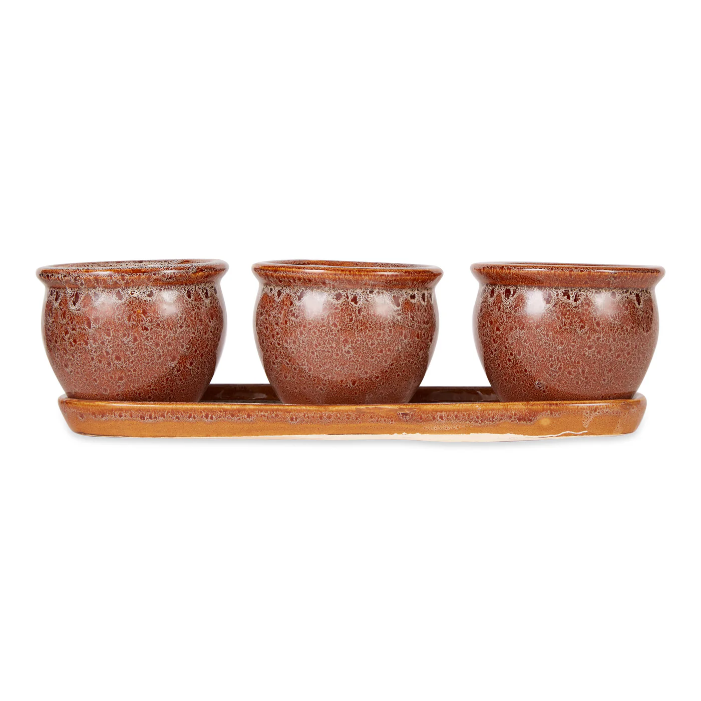 Set of 3 Brown Round Ceramic Small Planters - Ideal for Indoor Plants