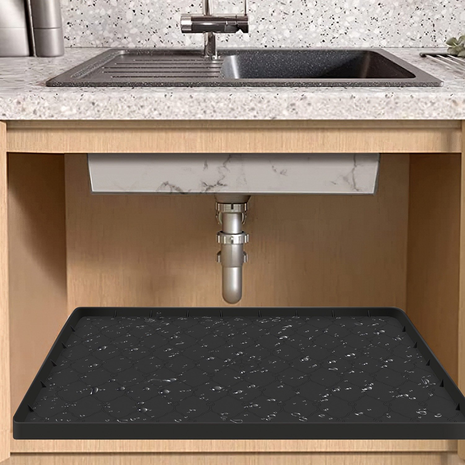 *Applicable Size*:Our under sink mat size is 22 x34in,which fits standard 36-inch kitchen and bathroom cabinets. The around 1in height also helps hold more water and gives you more time to handle any leaks.