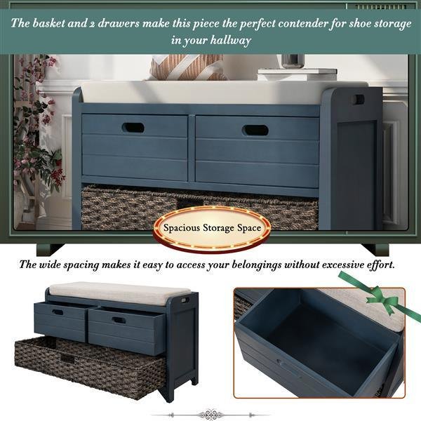 Storage Bench with Removable Basket and 2 Drawers, Fully Assembled Shoe Bench with Removable Cushion (Navy)