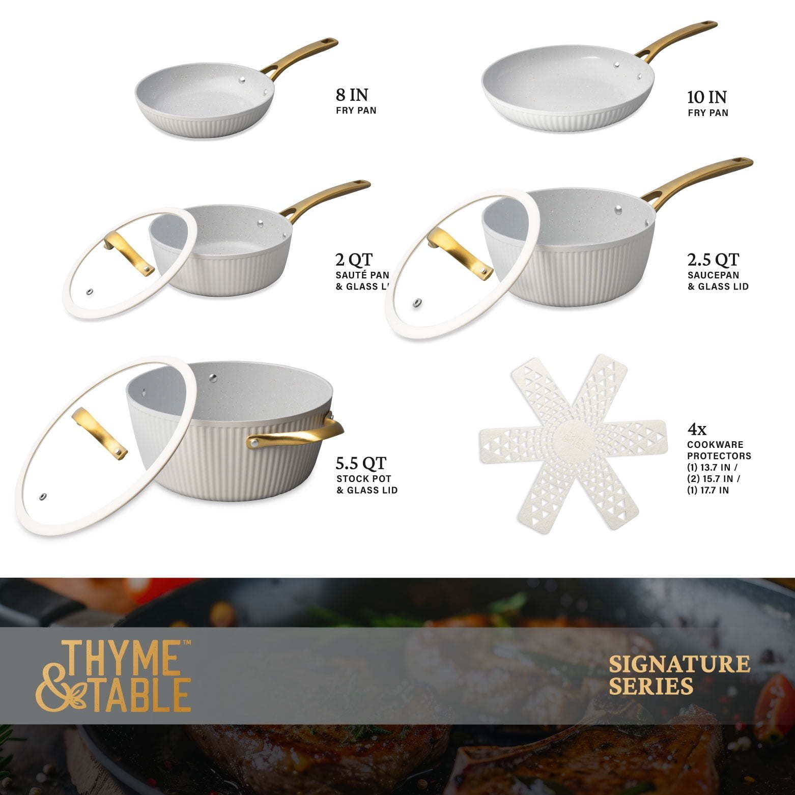 Capable of handling everything from frying and searing to simmering, braising, and boiling, this comprehensive set is designed to revolutionize your cooking experience. Offering versatility and durability in one stylish package, it elevates your kitchen setup. Enhance your culinary creativity with confidence using the Thyme & Table 12-Piece Ceramic Non-Stick Ribbed Cookware Set, White & Gold.