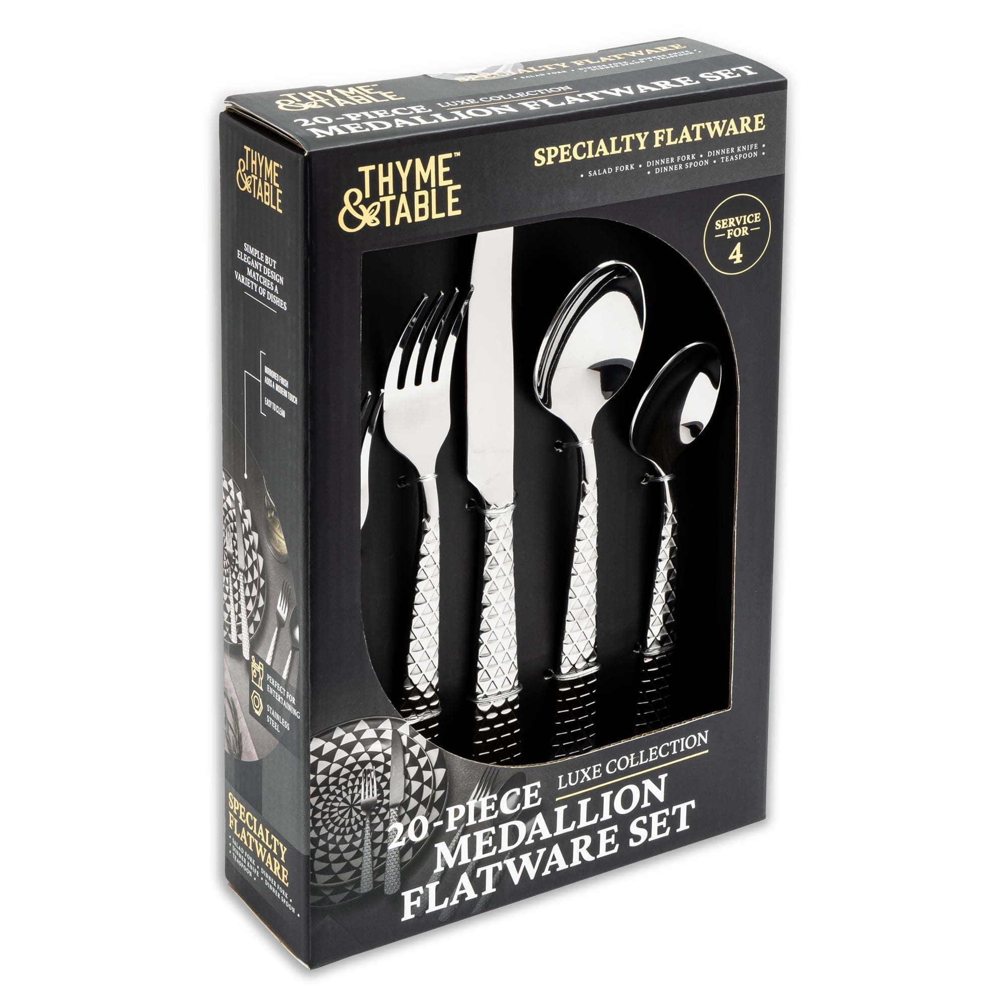 Thyme & Table 20-Piece Medallion Stainless Steel Flatware Set, Silver Thyme & Table 20-Piece Medallion Stainless Steel Flatware Set, Silver Thyme & Table 20-Piece Medallion Stainless Steel Flatware Set, Silver