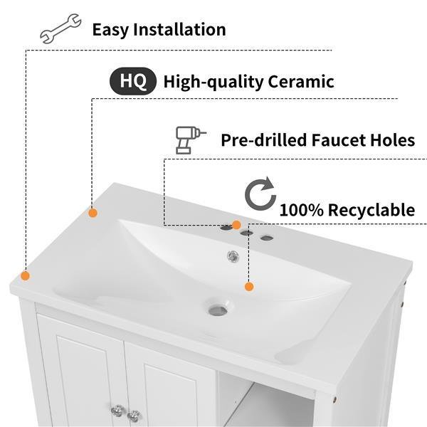 Home > [VIDEO] 30" Bathroom Vanity with Sink, Bathroom Storage Cabinet with Doors and Drawers, Solid Wood Frame, Ceramic Sink, White