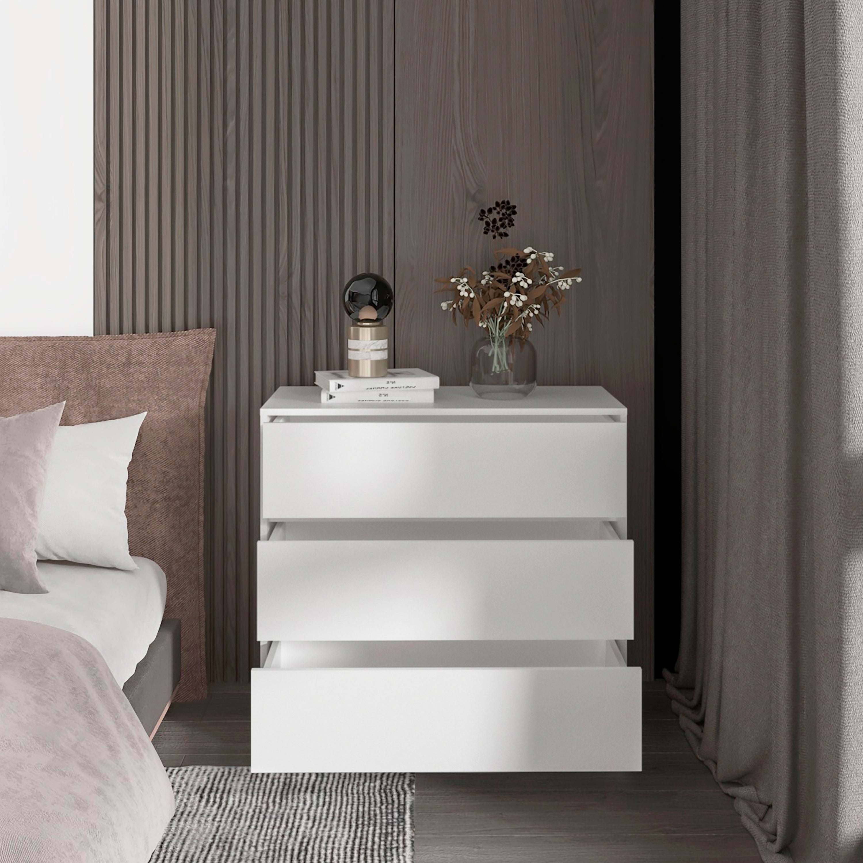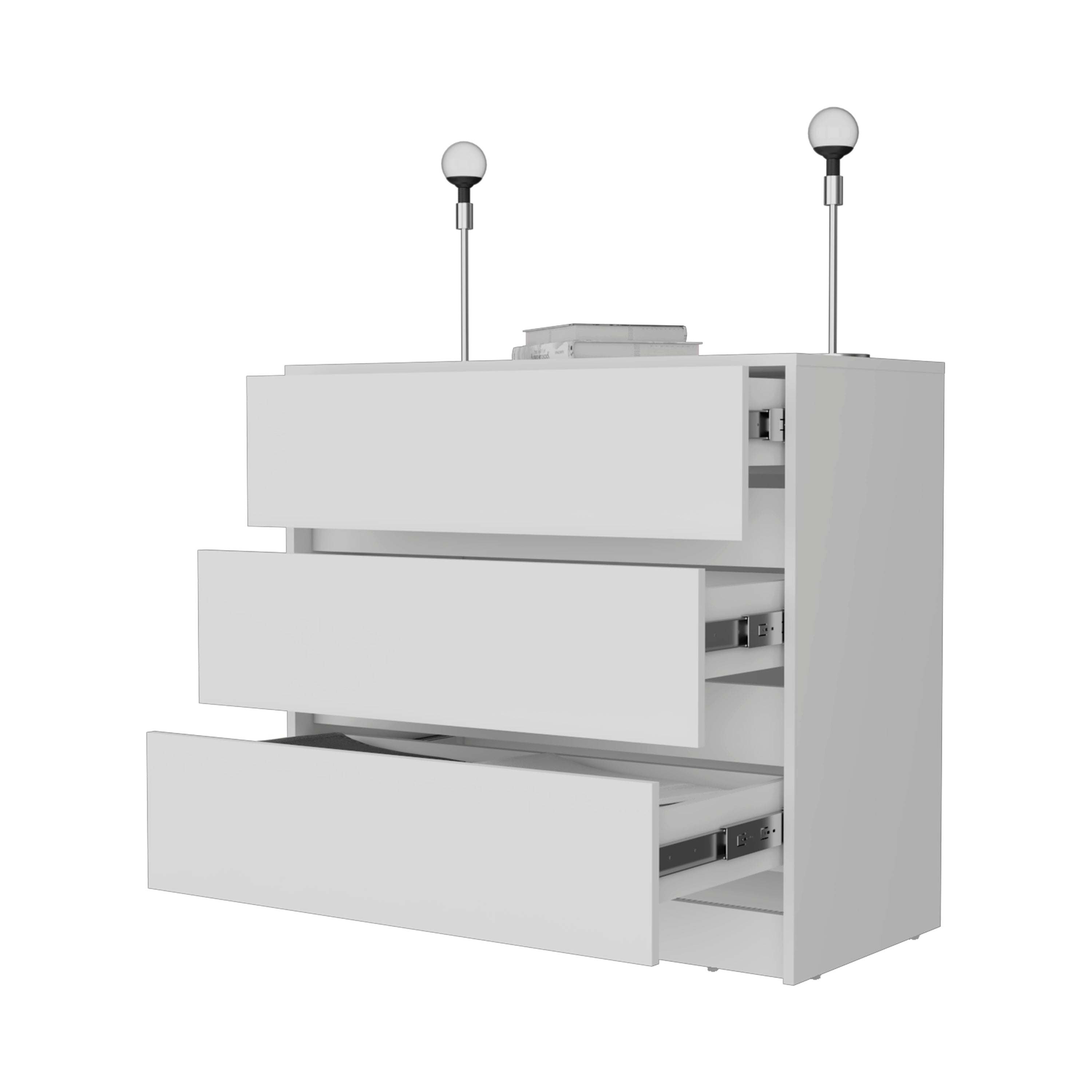 Introducing a 3-drawer dresser, meticulously crafted for seamless integration into your home decor. Boasting three generously sized drawers and a sleek white manufactured wood finish, it offers both ample storage space and a chic platform for showcasing your cherished decor pieces, ensuring effortless organization and timeless style in any room.